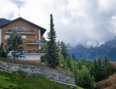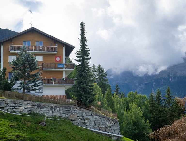 Once a beloved hotel, Haus Waldheim sits overlooking the Zermatt Valley and snow-topped mountains.